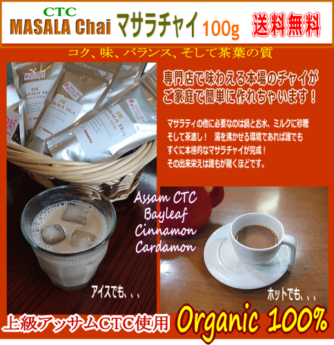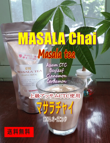 本物のチャイが簡単にご家庭で! マサラチャイ マサラティーオーガニック スパイス・ブレンド チャイ Masala Chai Masala Tea 100%オーガニック製品 【製品名】CTC マサラティー 【製造】ジャパ、ネパール 【内容量】100g 【原材料】アッサムCTC、ベイリーフ、シナモン、カルダモン 【配送に関する注意事項】 ※日本全国送料無料でお届けします。